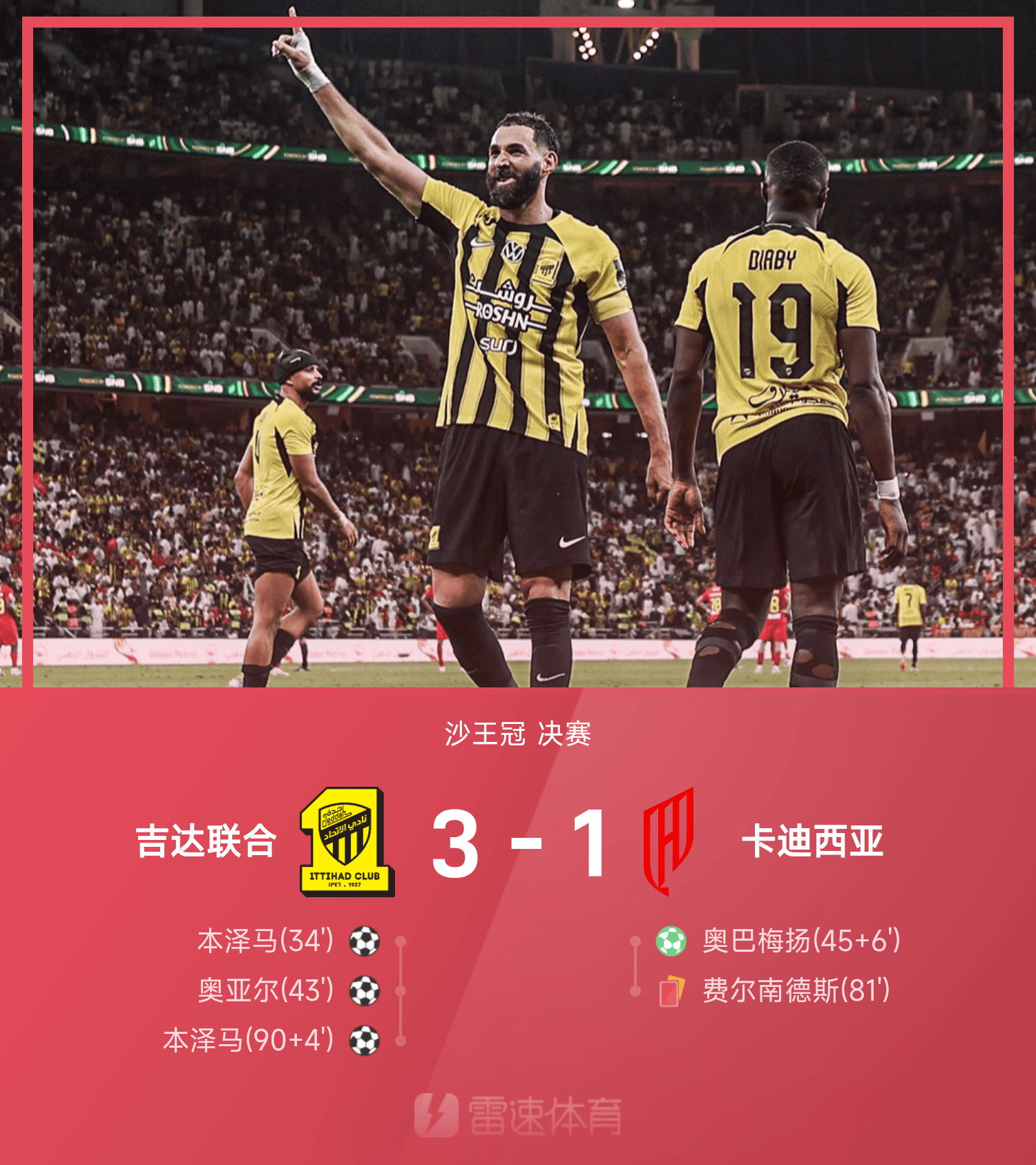 ⚽沙王冠战报:本泽马双响,吉达联合3-1十人卡迪西亚夺冠